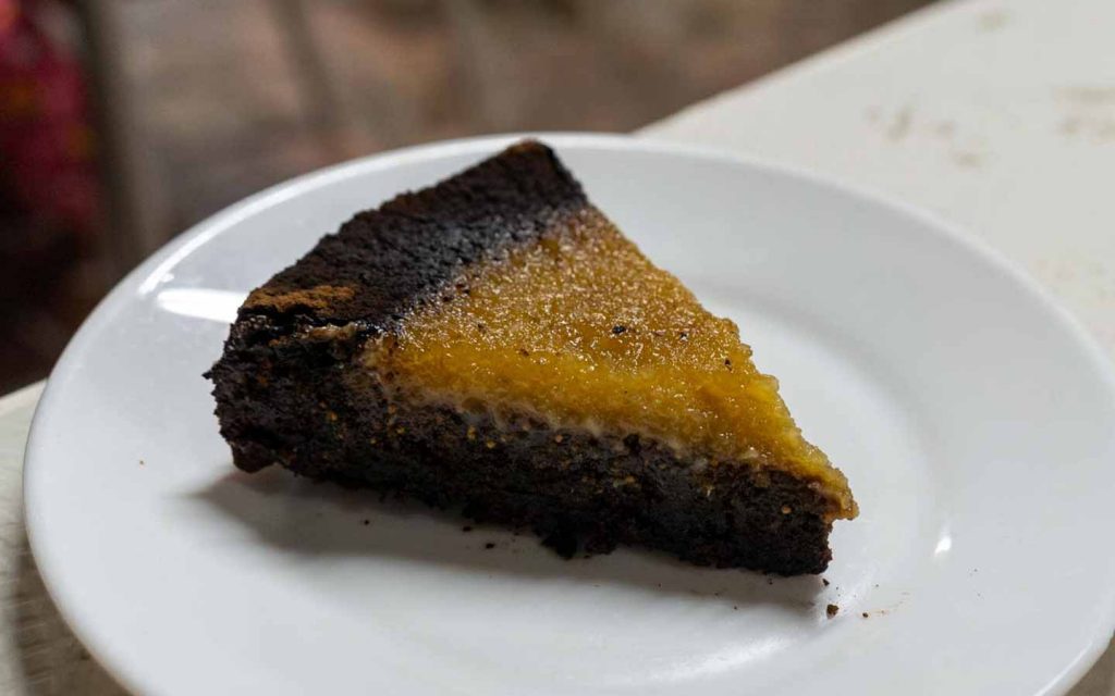 This is one of my all-time favourite Portuguese desserts and it makes the most of traditional Algarvian ingredients: figs, almonds and carob. I thought I hated carob — blame the health food shops of my childhood trying to disguise the bitter bean as healthy chocolate. The base cake layer is made of dried figs, Maria biscuits (plain sweet biscuits) and almonds. The filling is egg, almond, carob and flour and then it’s usually topped with a dusting of carob or a thin layer of fig jam.