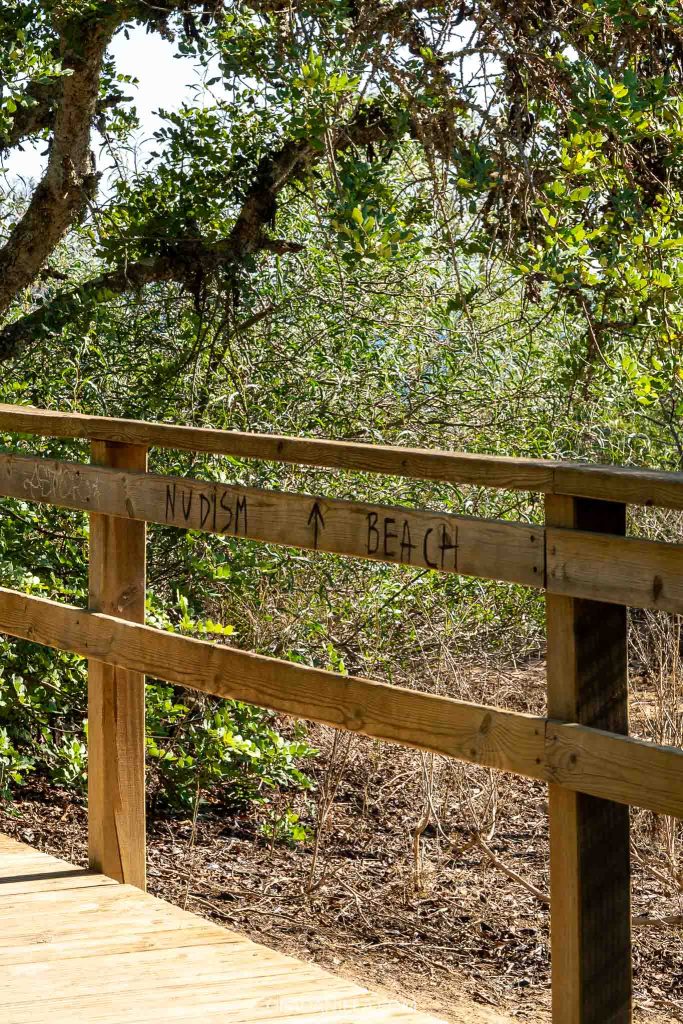 Follow a beautiful boardwalk past figs, pines and carob trees. This walk appears to do a loop from one side street to another but if you pay attention part-way along you’ll see “nudism beach” scribbled on one of the balustrades. Slip under a railing and follow a dirt path down to the lesser-known Praia do Canavial. From the top of the cliffs here there is a semi-maintained path and staircase down to the beach.