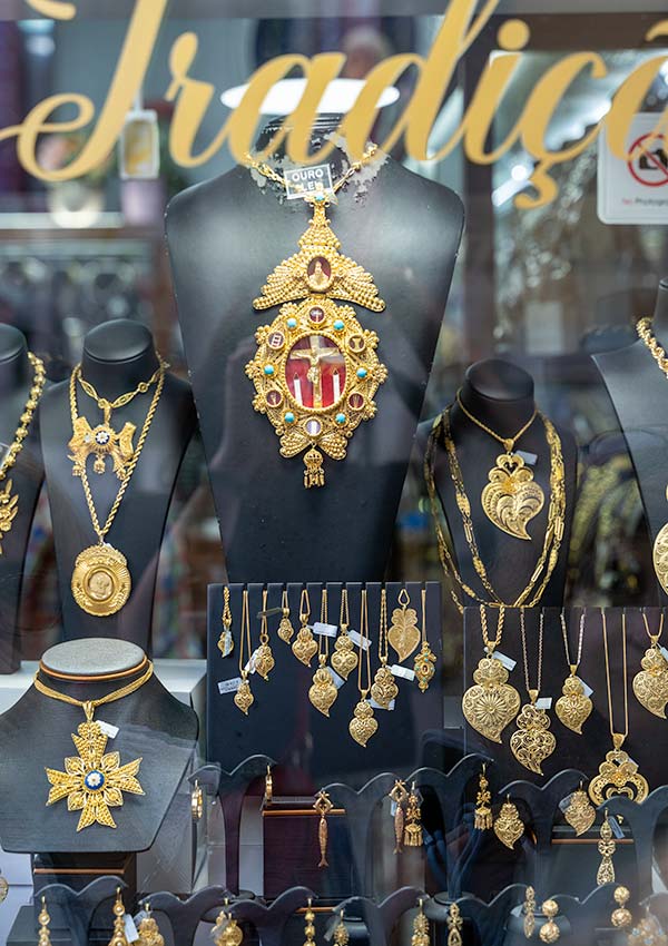 While wandering around the historic core of Viana do Castelo you’ll no doubt notice the high number of jewellers. While Viana do Castelo has never been a jewellery producer, the town’s main festival, Romaria d’Agonia, in August is a showcase of traditional Portuguese gold jewellery. Look in the windows and you’ll see filigree gold earrings, necklaces and more. The oldest style of jewellery is the Viana bead, or contas de Viana. Women would buy – or receive – these one by one, threading them onto wool.