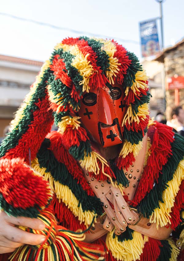 We arrive before 8.30am on a sunny winter Sunday to find the streets of Aigra Nova buzzing. A stream of villagers starts rolling down a steep cobbled street towards us. Men dressed in women’s clothing, women dressed as men. Many have underwear on the outside, or bras stuffed with oranges. All are wearing homemade masks made of raw cork bark, embellished with horns, moss and other natural features.
