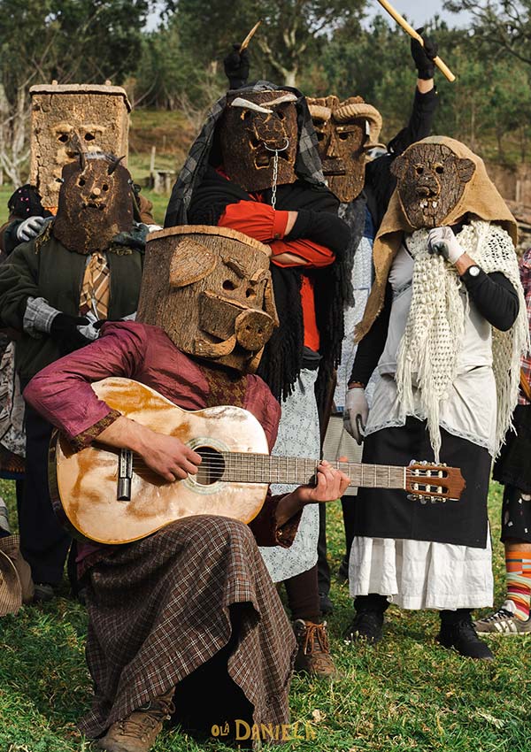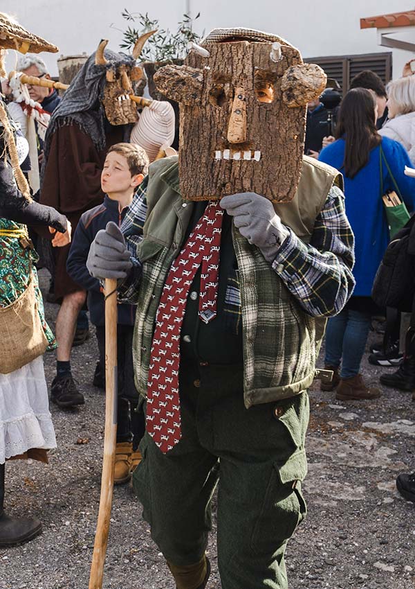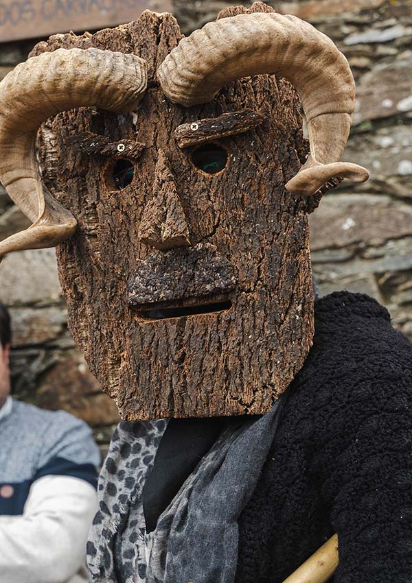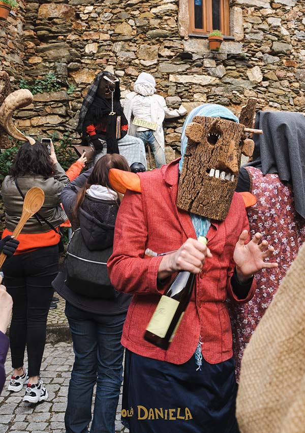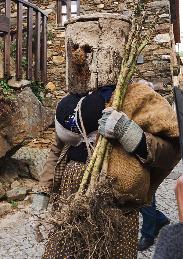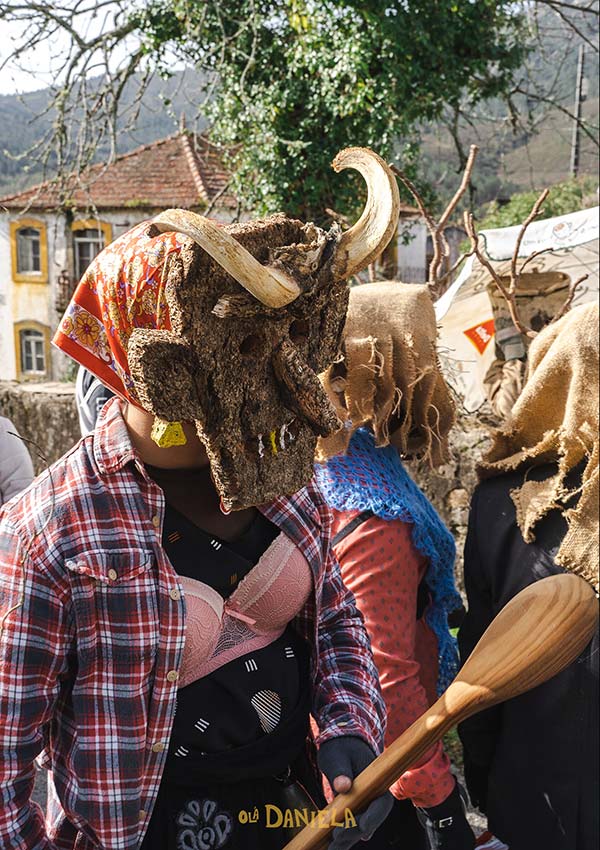 The sound of a gaita (bagpipe), drums, accordions and chatter emanates from the centre of Aigra Nova, a tiny one-resident schist village near Coimbra, in central Portugal. It’s 8.30am on a sunny winter Sunday and the usually quiet streets are a hive of activity. A stream of villagers starts rolling down a steep cobbled street towards us. Men dressed in women’s clothing, women dressed as men. Many have underwear on the outside, or bras stuffed with oranges. All are wearing homemade masks made of raw cork bark, embellished with horns, moss and other natural features.