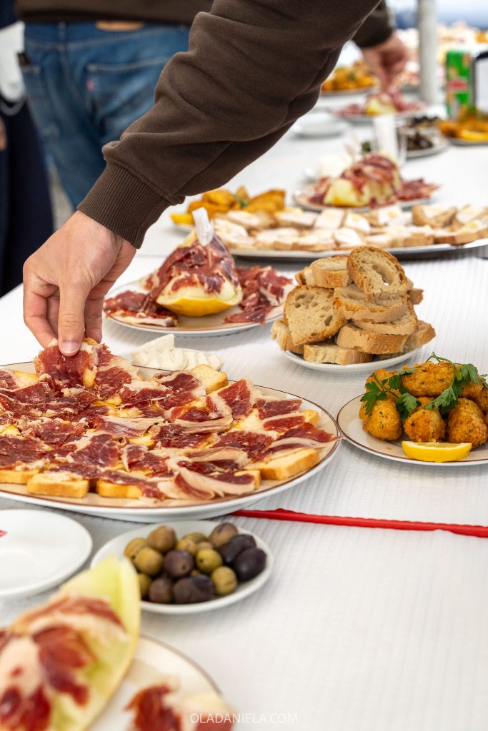 Our final stop was the town’s enoteca, which is Redondo’s cultural space dedicated to wine. In this large hall within the castle walls there was enough space for us to all sit down for a light meal. Tables were spread with even more charcuterie, croquettes, scrambled eggs and bread. Plus we each had a bowl of sopa de cozido, a stew made with smoked meats, potato and cabbage.