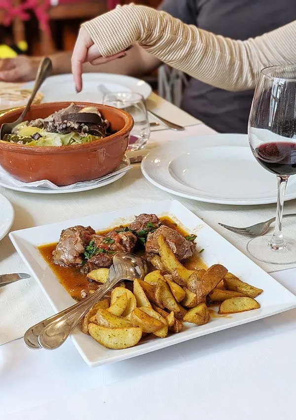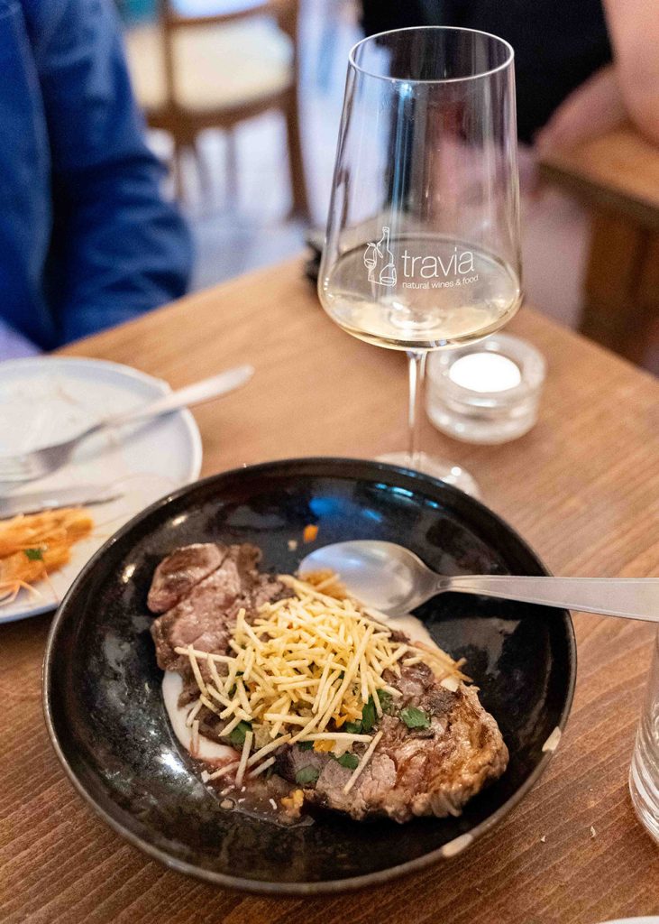 Travia is a fun little corner in the old town of Lagos that serves a menu of Portuguese share plates and natural wines. I liked their twist on Portuguese prawns, frying them with coconut milk and lemongrass instead of the usual garlic piri, and Travia’s take on pica pau, a classic Portuguese dish of chopped steak in gravy with pickles. Great list of bottles by the glass and very nice staff.