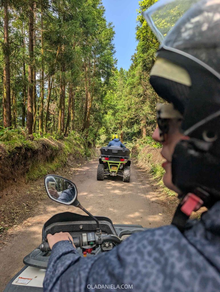 I’m not a massive adventure girlie, but I felt really safe with our guide, Bruno, from Azores Outdoor Activities. We were a group of three quads and four buggies (which have steering wheels more like a car and seem easier to drive). I preferred to be on the quad – we were right behind Bruno and could follow his every move and manoeuvre. The buggies were at the back of the pack. Our ascent was fairly slow-paced compared to the return journey – clearly, the group had found its confidence with their wheels.