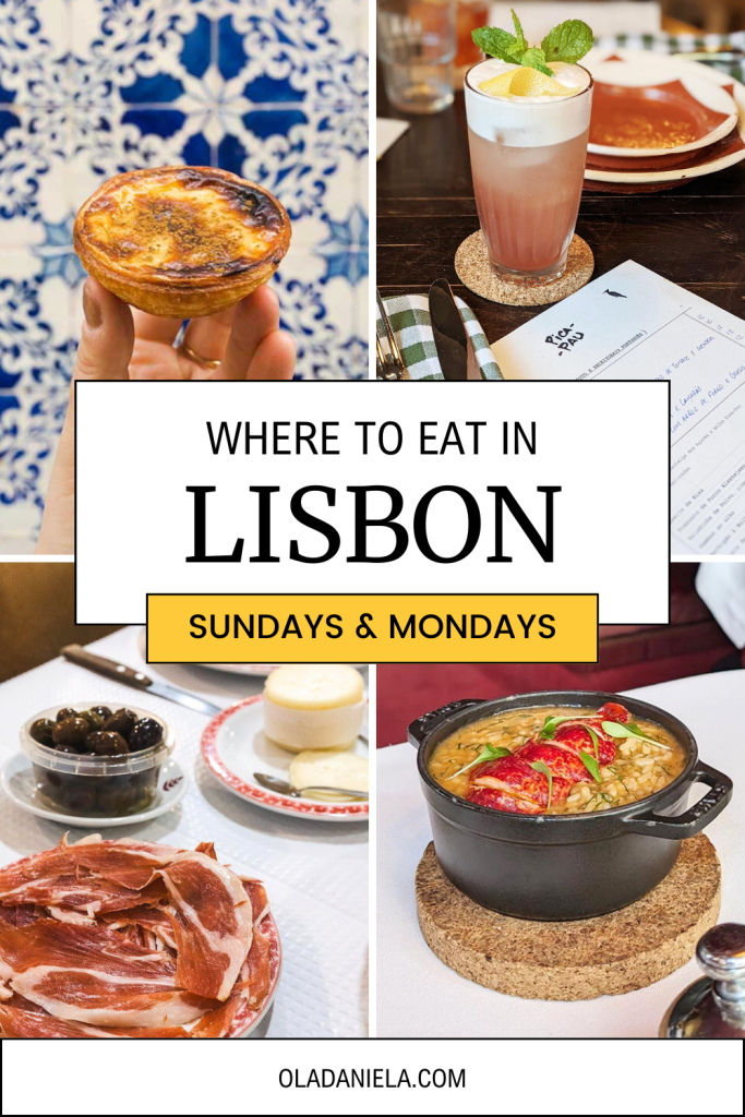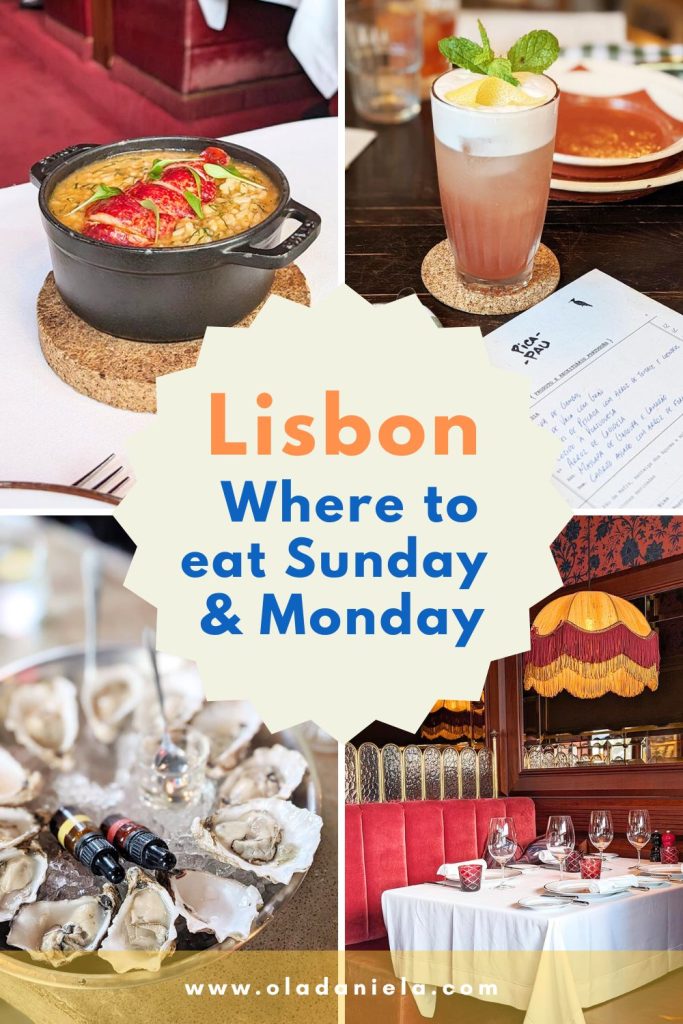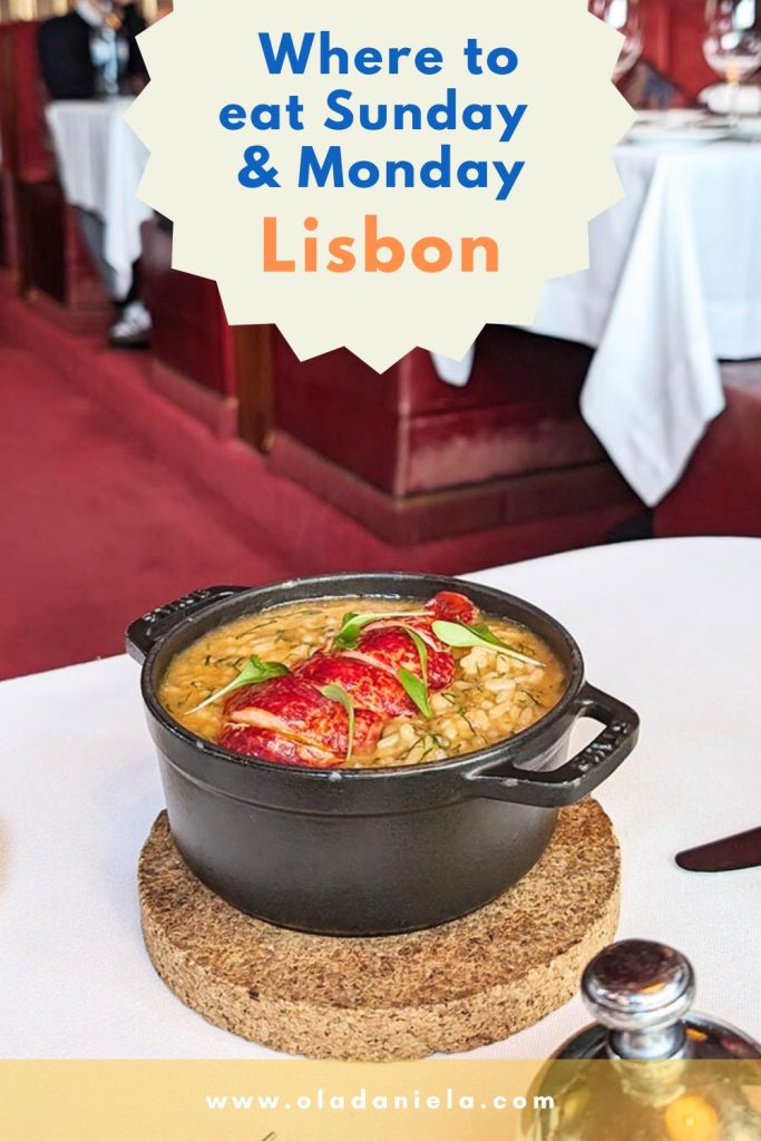 Here’s where to eat in Lisbon on a Sunday and Monday. I’ve included the neighbourhood, address, and whether they are open for lunch or dinner.