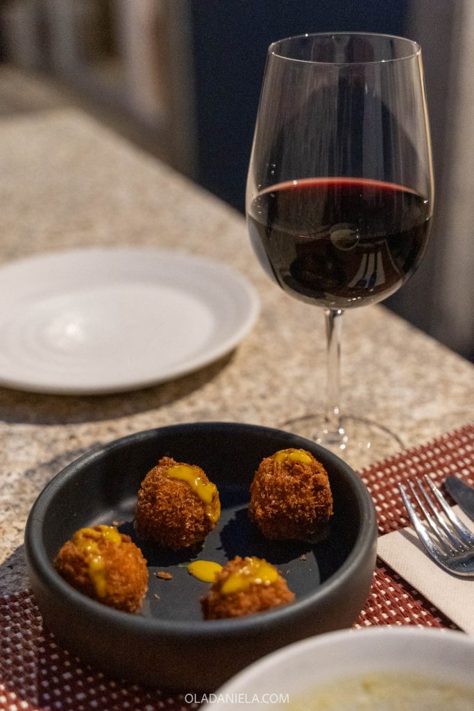 I’ll recommend two great family-run venues in Viseu for an evening drink and a spread of petiscos (Portugal’s answer to tapas). The first, di Vino Dão, is a great wine bar with a focus on wines from the local Dão region (one of my favourites). A mother-daughter duo opened the gorgeous space in February 2025, where you can pair wines with grazing boards of local cheese and charcuterie, or little snacks. I went for the chanfana croquettes – basically traditional Portuguese croquettes, but stuffed with shredded goat meat – a fun twist between two very Portuguese dishes. The wine bar is open for lunch with great deals, and you can organise a wine tasting too.