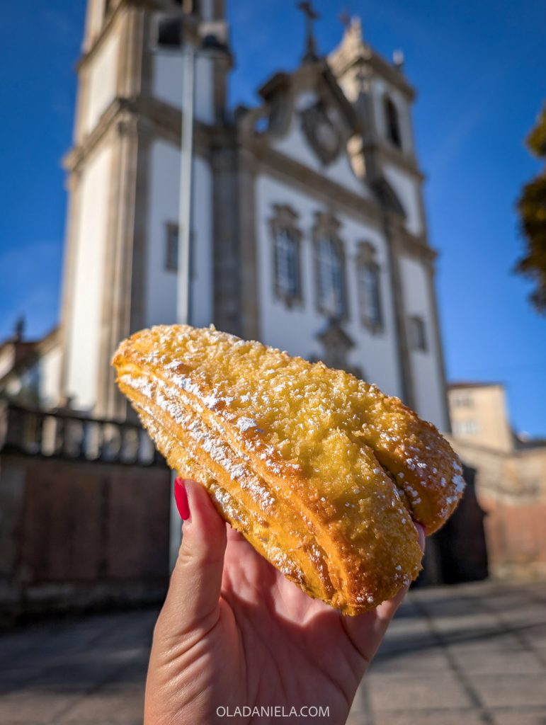 Every ancient city has its stories and legends, and Viseu has Viriato, a legendary warrior from the 2nd century BC. Naturally, there’s a sweet named after this mythical hero. It’s essentially a V-shaped pão de deus with egg-cream layers – thin layers of brioche dough layered with that egg yolk cream and topped with a sweet coconut crust.