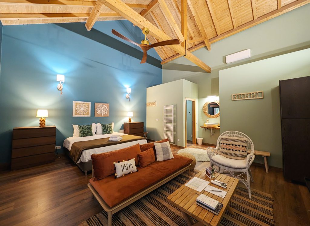 Quinta Carvalhas is made up of a series of old stone farmhouse buildings lovingly restored into various spaces and rooms, ideal for hosting retreats. There are 16 unique bedrooms split across a handful of buildings – from the original farmhouse to converted stone stables – and most are ensuite. I stayed in the Forest Room, a massive moody bedroom with so much space to spread out.
