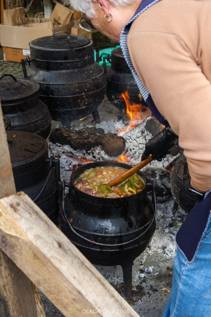 I went to this entrudo in 2024 on Shrove Tuesday and had a blast. After the reading of wills by the Comadre and Compadre, the fire is lit, the effigy burns (with fireworks!) and then the feast begins! We’d seen steaming iron cauldrons of feijoada (a hearty bean and meat stew) and caldo de farinha (a corn flour soup with cabbage and smoked meats) cook over open fires all afternoon, and finally got to tuck in. By 6pm most had gone home, but my girlfriends and I found ourselves in what felt like the only tiny bar, eating bifanas (pork sandwiches) and dancing to an accordian.