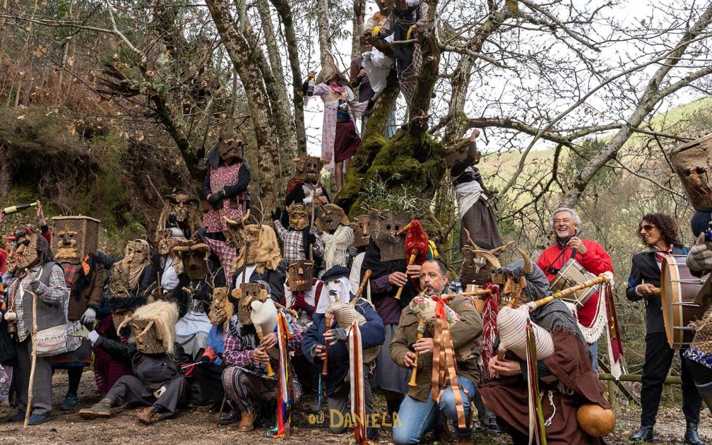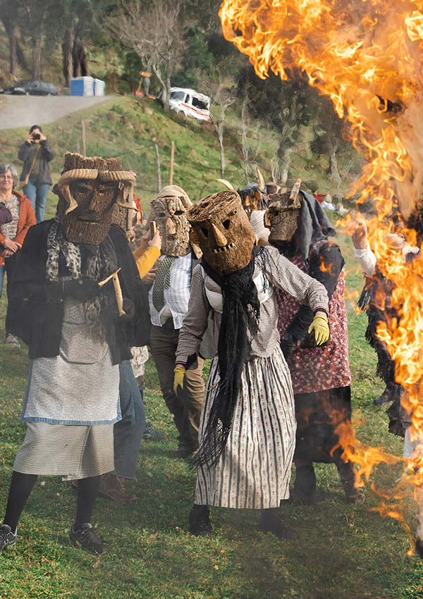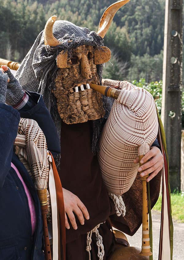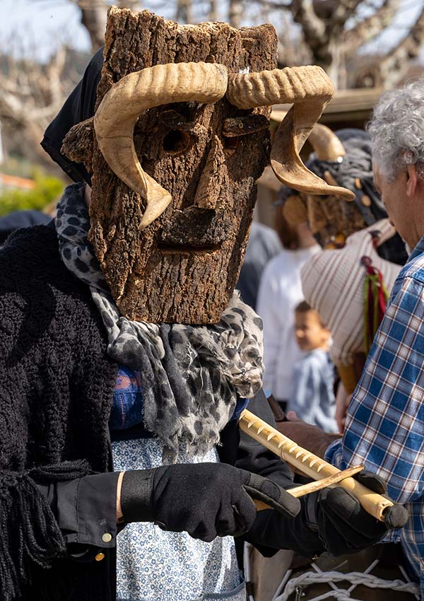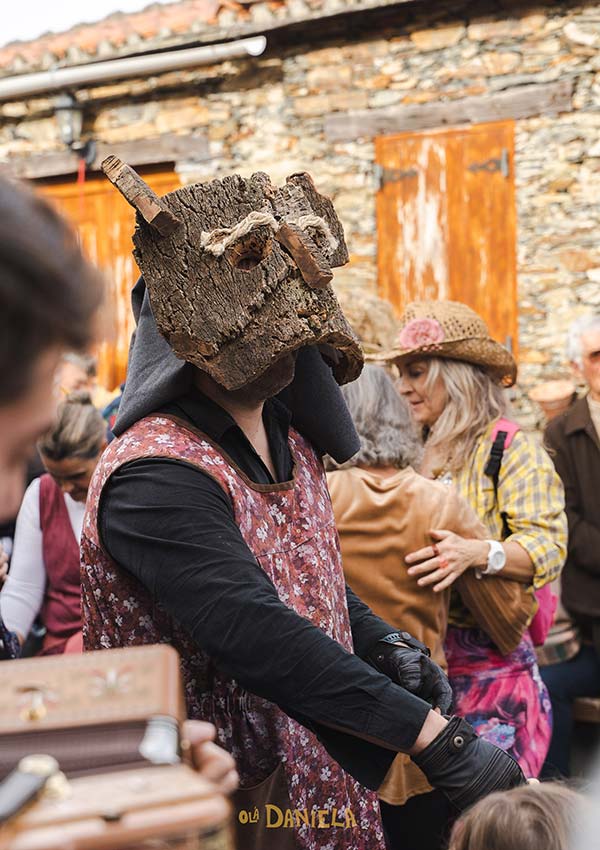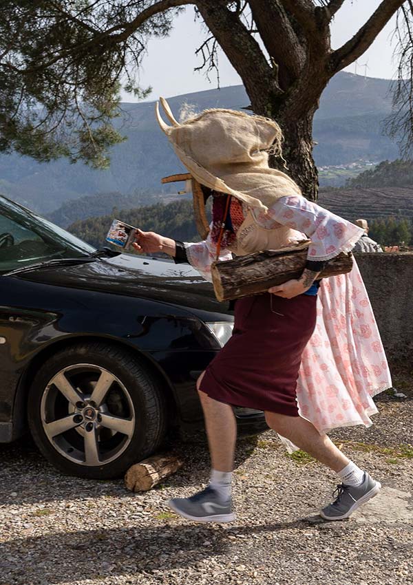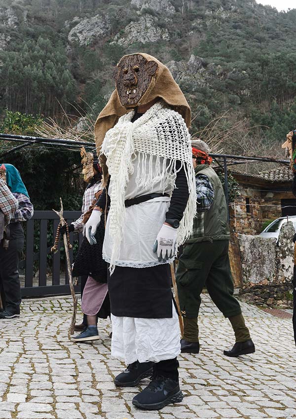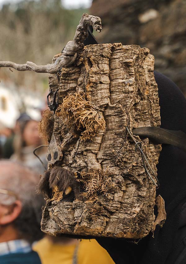The sound of a gaita (bagpipe), drums, accordions and chatter emanates from the centre of Aigra Nova, a tiny one-resident schist village near Coimbra, in central Portugal. It’s 8.30am on a sunny winter Sunday and the usually quiet streets are a hive of activity. A stream of villagers starts rolling down a steep cobbled street towards us. Men dressed in women’s clothing, women dressed as men. Many have underwear on the outside, or bras stuffed with oranges. All are wearing homemade masks made of raw cork bark, embellished with horns, moss and other natural features.