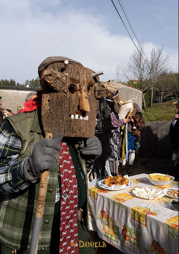 The road soon gave way to a dirt track as we reached what might be the most remote village I’ve ever been to in Portugal. In the dewy morning light Pena looked absolutely magical. We piled out of the buses and joined a procession toward the centre of the village. The noisy, cheeky, masked foliões had pockets filled with conkers and started throwing them at each other and the growing mass of bystanders. At some other traditional carnivals in Portugal the villagers act like the devil but these characters are just cheeky. They run amuck moving pot plants and bins – harmless, naughty fun.