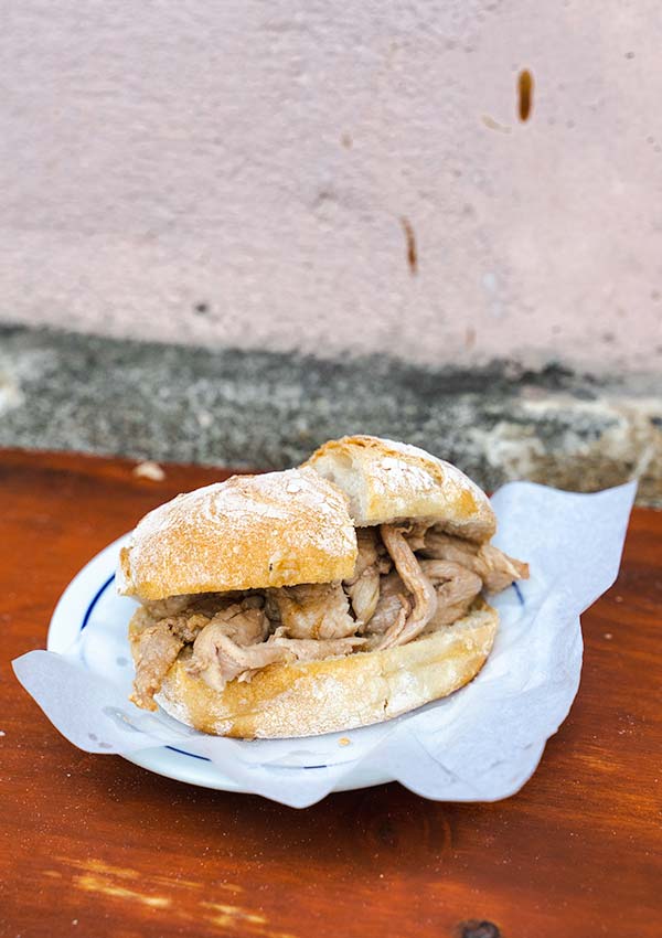 This pork sandwich looks different depending on where you eat it. In Porto and Vendas Novas, they stew pork steaks in a deliciously fatty, flavoursome and slightly spicy broth and the bread soaks up some of the goodness.