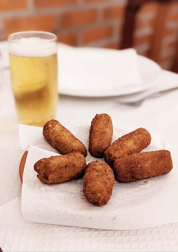 Croquetes: Long cylindrical, crumbed croquettes with a meaty filling.