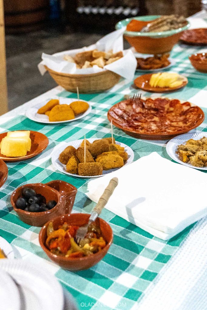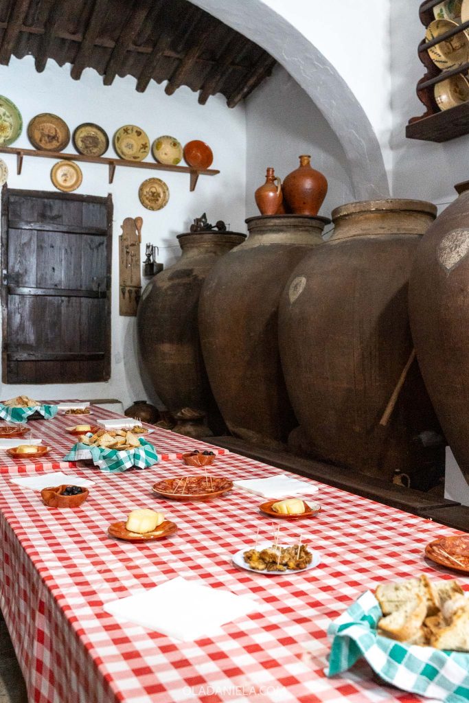 The third stop sent my jaw to the floor. We entered the inconspicuous door of a private home to find a family’s cellar filled with 14 talhas and dozens of antique terracotta Redondo plates. Down the centre was a long table covered in a red checked tablecloth where a spread of local cheese, charcuterie and salgados lay in wait.