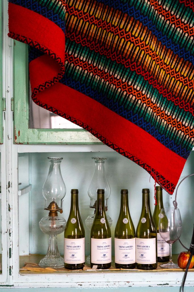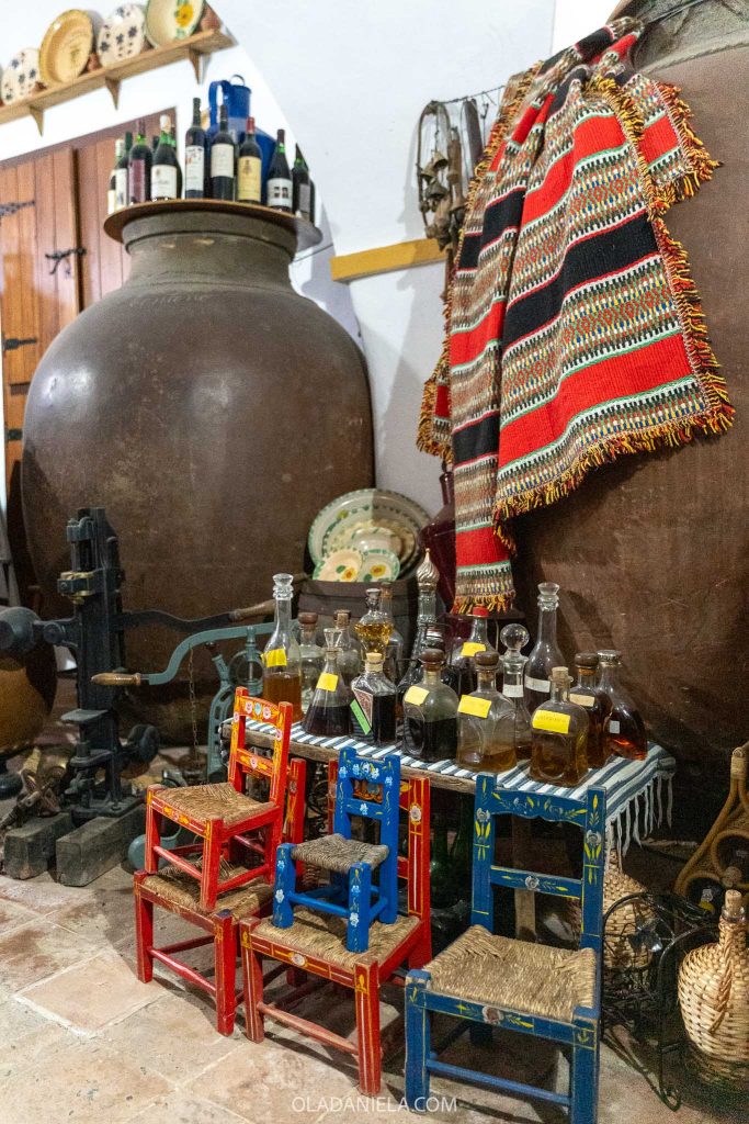 Topping every talha, hanging from the cellar, and tucked around the edges were collections of historic farming equipment, baskets, ceramics, textiles and blankets. Plus a never-ending collection of homemade bagaço – a wine-based spirit held in reused jars and bottles and flavoured with whatever the friendly owner could get his hands on.
