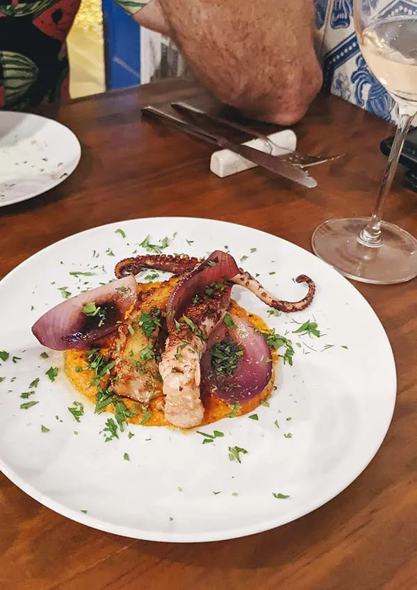 Travia is a fun little corner in the old town of Lagos that serves a menu of Portuguese share plates and natural wines. I liked their twist on Portuguese prawns, frying them with coconut milk and lemongrass instead of the usual garlic piri, and Travia’s take on pica pau, a classic Portuguese dish of chopped steak in gravy with pickles. Great list of bottles by the glass and very nice staff.